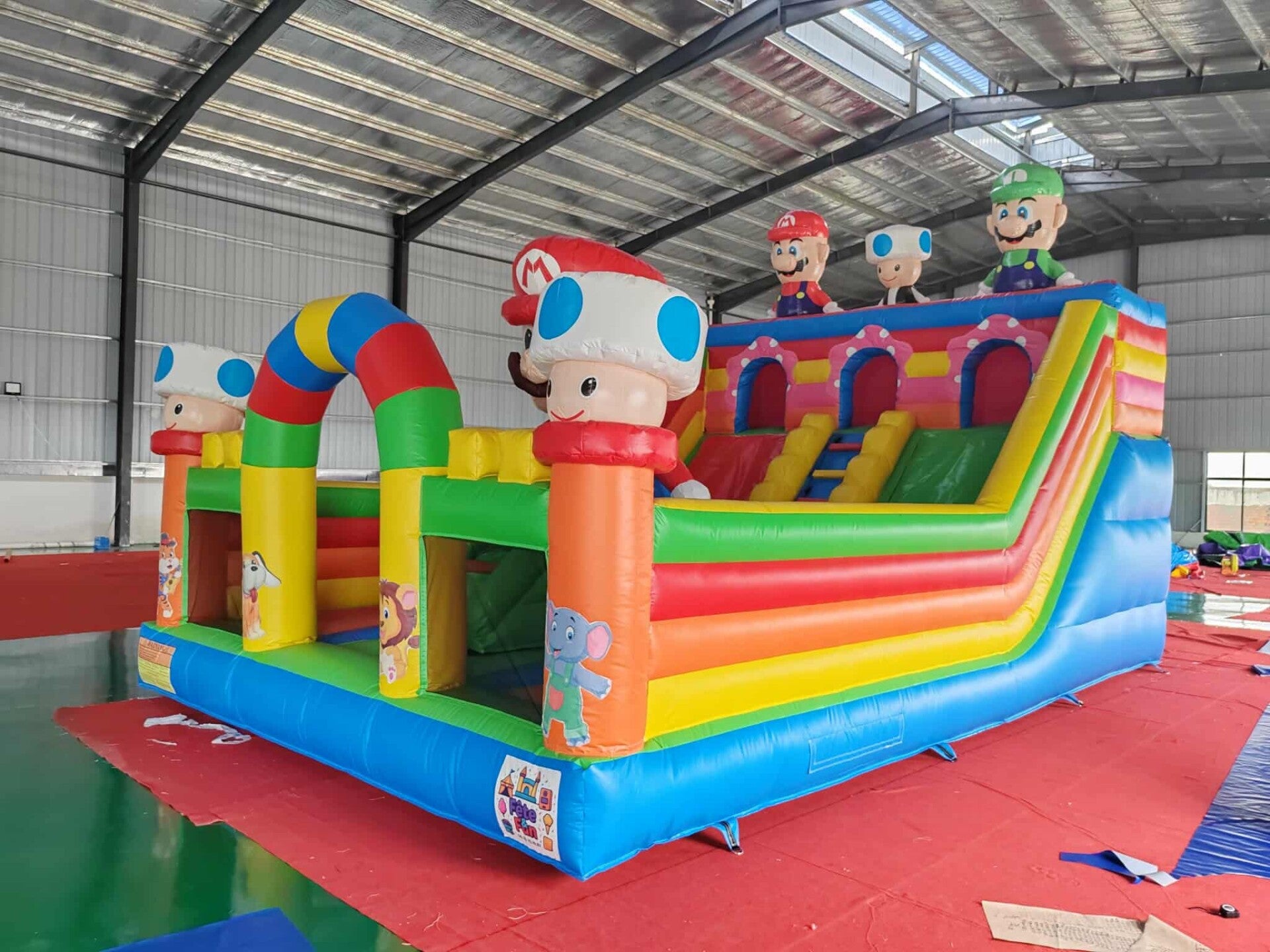 Le château gonflable thème Mario est une structure colorée et festive inspirée de l’univers du célèbre jeu vidéo Super Mario Bros. de Nintendo. Décoré avec des illustrations de Mario, Luigi, Princesse Peach et Bowser, ainsi que des célèbres champignons et blocs “?” emblématiques du Royaume Champignon, il plonge les enfants dans une aventure ludique et immersive. Conçu avec des parois gonflables sécurisées et une grande surface de saut, parfois accompagnée d’un toboggan intégré, il est idéal pour les anniversaires, fêtes à thème et événements festifs, offrant des heures d’amusement aux petits fans de jeux vidéo. TAILLE 8x5x5.20