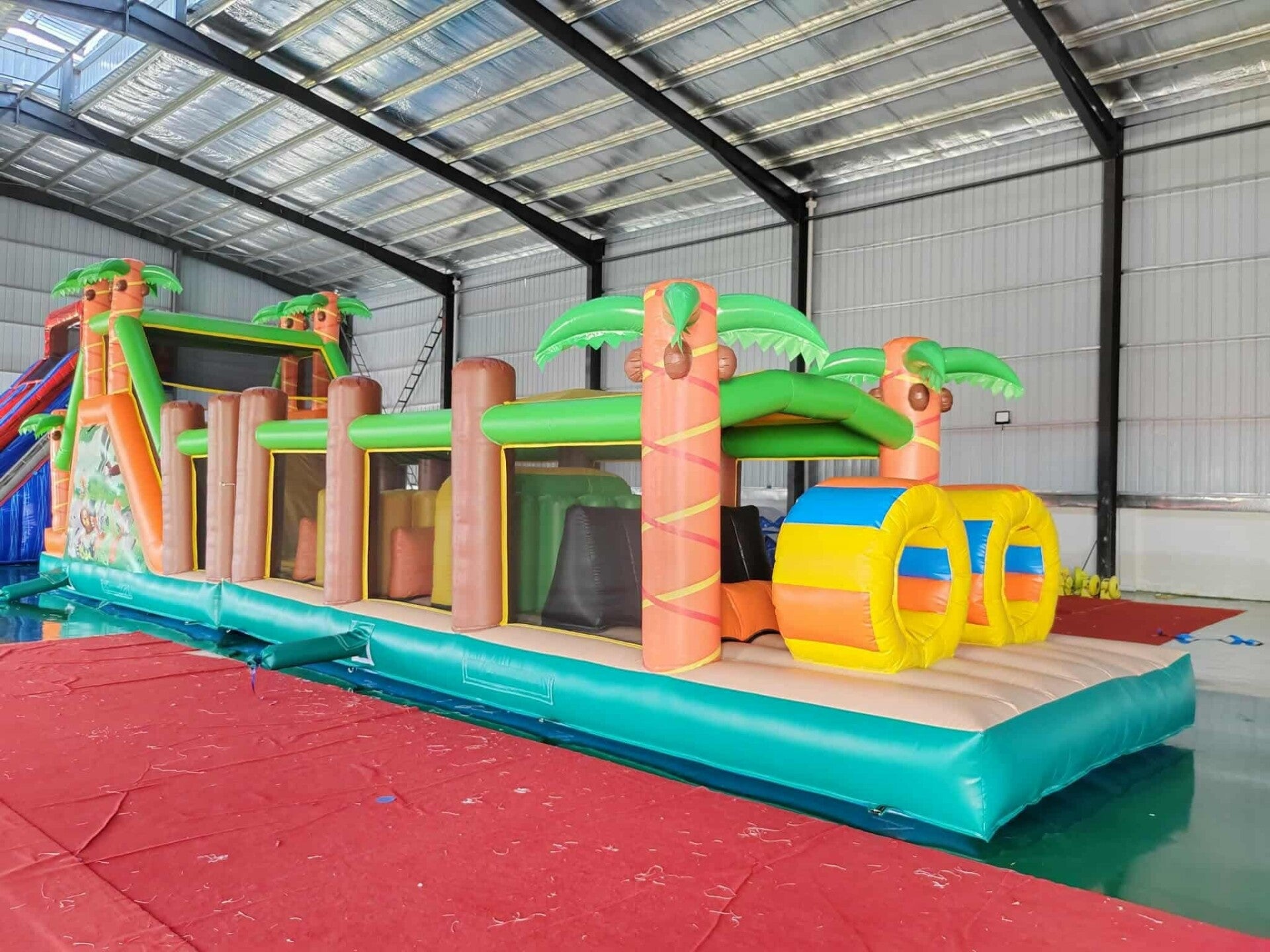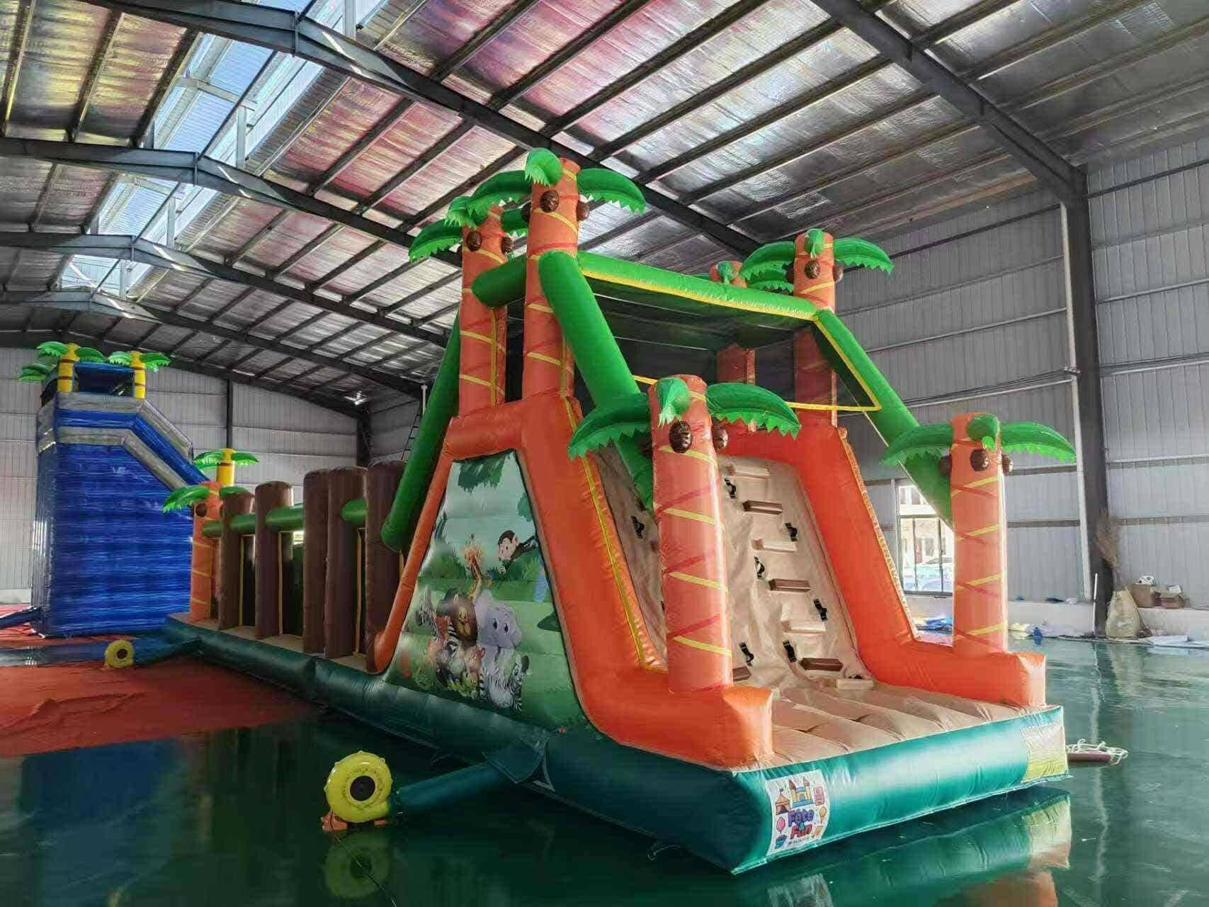 Le parcours gonflable thème jungle est une structure ludique et immersive qui transporte les enfants au cœur d’une aventure sauvage inspirée des paysages exotiques et de l’univers de la jungle. Décoré de palmiers géants, de lianes suspendues, d’animaux comme des singes, lions et éléphants, ainsi que de motifs tropicaux aux couleurs vertes et naturelles, il crée une ambiance dépaysante et dynamique. Composé de différents obstacles à franchir, tunnels à traverser, murs à escalader et parfois d’un toboggan final, ce parcours stimule l’agilité, l’équilibre et l’esprit d’aventure. Conçu avec des matériaux résistants et des filets de protection pour assurer la sécurité, il est idéal pour les anniversaires, fêtes à thème, kermesses et événements en plein air, offrant aux enfants une expérience amusante et pleine d’exploration. TAILLE 16X3.30X4.60